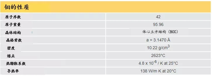 钼是所有元素中熔点最高的元素之一,但与其它大多数高熔点金属不同,钼的密度仅比铁的密度高25%。钼的热膨胀系数是工程材料中最低的,而其导热系数则超过了大多数元素。