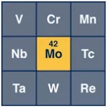 钼在元素周期表中的原子序数为42,属于第二系列VIB族过渡元素,位于铬和钨之间(纵向)以及铌和锝之间(横向)。