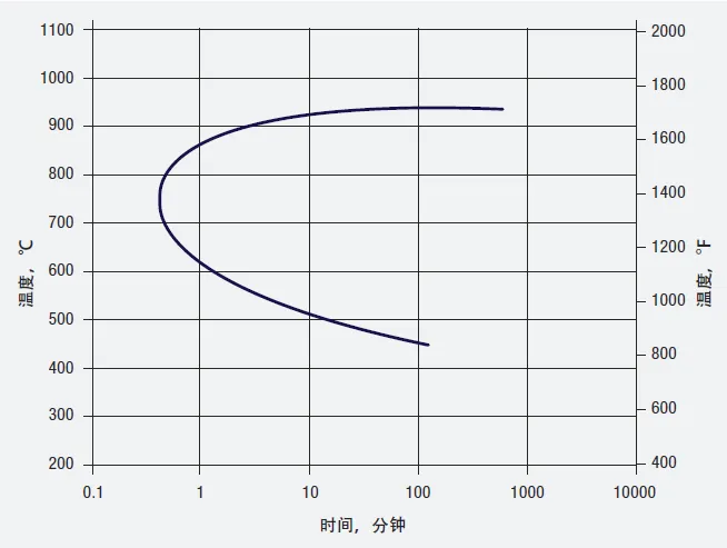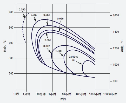1)采用低碳牌号(如:201L、304L、316L或317L)。高性能奥氏体不锈钢均为低碳牌号。碳含量低可以推迟冷却过程中碳化铬析出(敏化)的起始时间 (图5)。这样,在热成型和焊接时,材料不会发生敏化,大断面工件同样如此。但是,如果长期暴露在临界敏化温度区间,L牌号也做不到耐敏化。