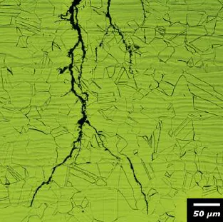 晶间腐蚀在晶界或晶界周围迅速形成,对晶粒无影响或影响甚微。对于标准奥氏体不锈钢来说,这种腐蚀通常与焊接或热处理过程中发生的敏化有关。敏化程度和环境的腐蚀性不同,会出现多种形式的腐蚀。如果是中等敏化,可能形成点蚀。如果沿晶界形成一个连续的碳化铬网,则会形成晶间腐蚀, 导致表面晶粒脱落。敏化组织、腐蚀环境和拉伸应力的合力作用会产生晶间应力腐蚀开裂。设计人员和加工厂家可以通过以下三种方法减少敏化及后续的晶间腐蚀:
