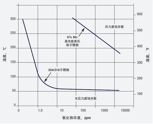 304和316不锈钢的镍含量为8%-12%,镍含量更高的奥氏体不锈钢,耐氯化物应力腐蚀开裂的性能更好。高性能奥氏体不锈钢含有更多的铬、钼和镍,所以,耐氯化物应力腐蚀开裂的性能特别好。例如,6%Mo不锈钢(图4),只有在温度和氯化物含量非常高的情况下才会出现开裂。温度阈值远远高于100℃(212℉),说明在大气压力下,沸腾的中性氯化物溶液不会使6%Mo和类似的高性能奥氏体不锈钢出现CSCC,比304和316不锈钢有了很大的改进。