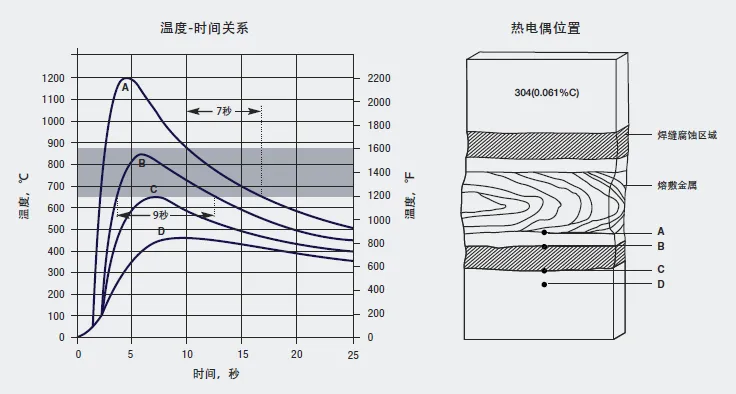 图6 电弧焊304不锈钢的时间-温度曲线以及发生敏化和焊缝腐蚀的区域。左图灰色部分表示快速敏化的温度区间。