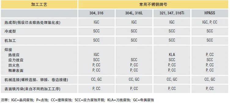 表1 加工工艺对腐蚀形式产生的潜在影响(实际影响与许多因素有关)