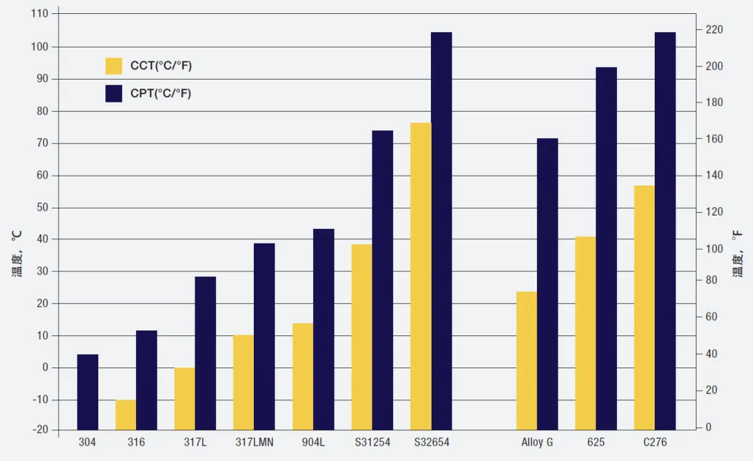 排序试验及试验所得的临界温度,不能具体地预测某种合金在与试验溶液不同的环境下具有怎样的表现,但是,CCT或CPT高的合金在现实环境中一般都具有较好的耐蚀性。实践经验告诉我们,临界温度和实际使用性能之间存在一定关联性。比如,316L在ASTM G48 中的CPT为10℃(50℉),不适用于海水蒸汽冷凝器管;高性能奥氏体不锈钢S31254的CPT为75℃(167℉), 很适合在该环境中使用。