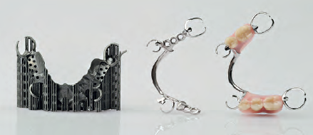 制造复杂局部义齿的金属部分,从左到右:在支撑结构上3D打印局部义齿、移除支撑结构并抛光、完成后©EOS