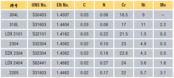 EDX2304是传统的2304双相不锈钢的衍生牌号,与后者相比,其铬、钼(0.5% vs 0.3%)和氮含量较高。这是钢厂为海洋油气行业开发的钢种,目前也用于储罐。此改进型牌号无论是强度还是耐蚀性都优于2304,PREN值确保在28以上,高于2304(PREN值26)。第一个采用该牌号储罐的用户是一家瑞典公司,第二个此牌号储罐项目在荷兰。