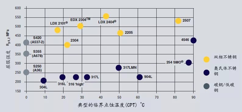 图1 多个不锈钢牌号的屈服强度和耐蚀性能,碳钢作为对比。@Outokumpu