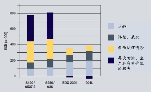 图2还说明了双相不锈钢的长期成本优势。碳钢储罐每隔5-10年必须重新喷涂以保护其不被腐蚀。阴极保护和阳极保护也会增加运行成本,如电费、设备维护和电极更换的费用。双相不锈钢除清洗外,几乎不需要其它维护,提高了储罐利用率和生产率。双相不锈钢储罐如果选用正确,可以无限期使用下去。即使储罐由于某些原因(并非损坏)退役,仍有较高的废钢价值,可以进一步降低寿命周期成本。