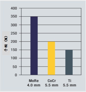 对于中小尺寸的外科植入物来说,因植入物密度高而增加的重量很小,Mo-Re合金较高的密度影响不大。然而,在整形外科应用中一般都不希望材料的弹性模量太高,因为刚性植入物会降低骨骼上的荷载,这种现象叫做“应力遮挡”。因为人体承担的负荷较小,因此会减弱骨骼的生长。植入物尺寸越大,这种效应就越明显,因此设计师们必须设法保持植入物尺寸最小化。这就意味着高模量合金必须同时具有很高的强度,这样才可以保证横截面尺寸更薄一些,而Mo-Re正好具备这一优势。