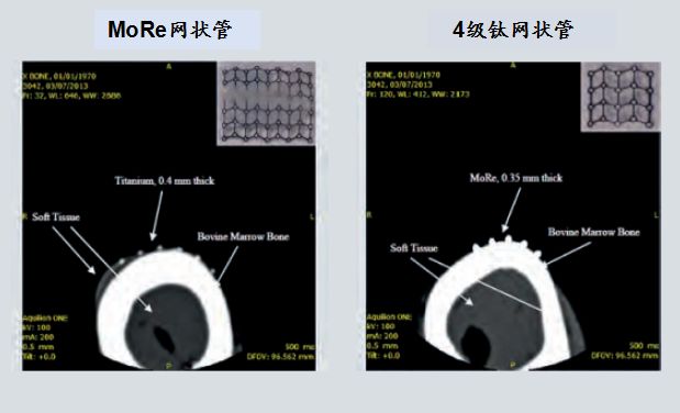 采用实时X射线成像对支架放置进行监控,这样外科医生能够在屏幕上看到支架,并将其送到所需位置。放射吸收率与材料密度成正比,Mo-Re的密度为13.5克/立方厘米,而传统材料的密度仅为4.5克/立方厘米(钛)~8.8克/立方厘米(钴-铬)。与传统合金相比,Mo-Re支架的放射吸收率高很多,在植入过程中,医生看到的清晰程度要比传统支架高得多,因此在操控和放置Mo-Re支架时具有更高的安全性和准确性。