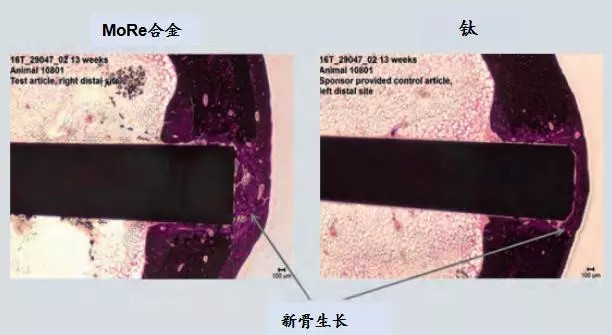 Mo-Re合金植入物不存在生物相容性的问题或过敏反应,而含有镍、钴或铬的植入物有时会出现这些问题。许多生物相容性试验对 Mo-Re合金和Ti-6Al-4V合金做了对比,结果总结在ASTM F3273-17中。骨传导性 (植入物表面骨骼生长过程) 是另一个重要的性能,据观察,只有生物相容性良好的植入物材料才具备这种能力。在一项骨植入研究中,将试验钉植入动物的股骨中,结果发现,在植入4周、13周和26周后,MoRe和Ti-6Al-4V 钉具有相近的骨传导性。